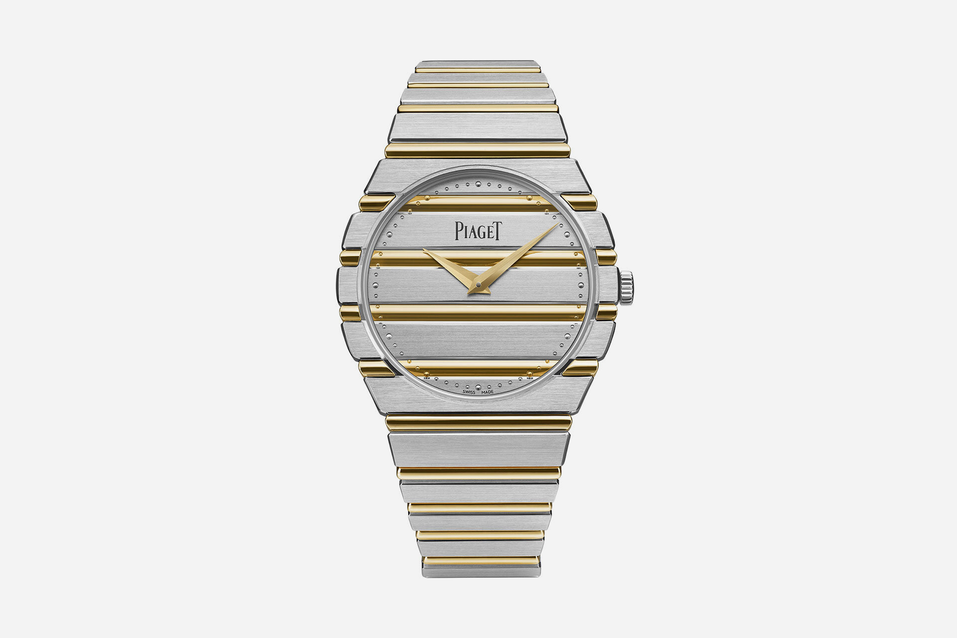 Reviving a style from 1979, Piaget's Polo 79 Two-Tone timepiece is a delightful throwback. It's defined by its 38mm case made from 18K white gold with 18K yellow gold gadroons, giving it a distinctive striped appearance. The hour and minute handset are also made from yellow gold, and the micro-rotor of the 1200P1 Manufacture self-winding movement is made from 22K yellow gold, engraved with Piaget's coat of arms and visible through the sapphire caseback. It's finished with a matching bracelet and is available now.
