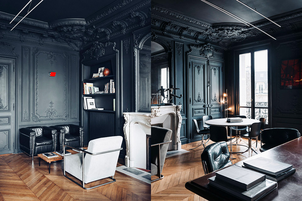 Located in Paris' iconic circular square, the Place Saint George is a company office space with a residential atmosphere. Traditional moldings and a herringbone wood flooring were left intact to compliment its historic setting, while sleek black lacquer gives the intricate woodwork a modern update. The antique quality of the carvings is offset with a contemporary collection of furnishings, featuring chrome accents and vibrant finishes. These additions mixed with the room's existing character give the space a living room aesthetic with the functionality of a workspace.