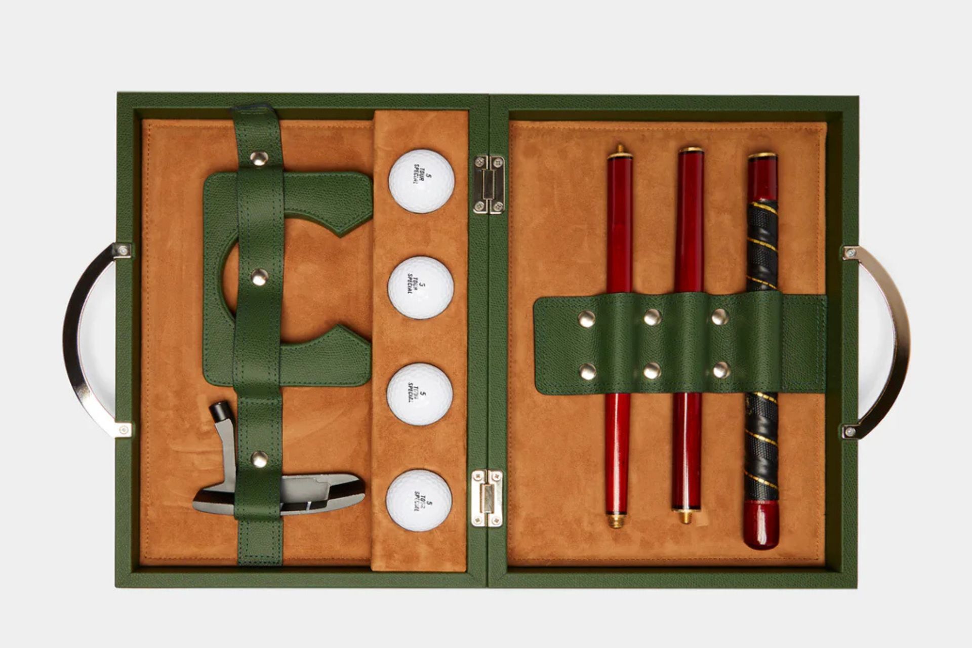 Italian leather and games specialist Renzo Romagnoli has been handcrafting elevated versions of classic games since 1972, and that same thoughtful approach is applied to each detail of this compact golf set. Designed with everything you need to play away from home, the set includes a pebbled leather carry case, four golf balls, and a portable three-piece club that disassembles for easy transport. Each piece is worked by hand using genuine calf, grain, and chrome-tanned leather, so you don't have to choose between traveling light and traveling well.