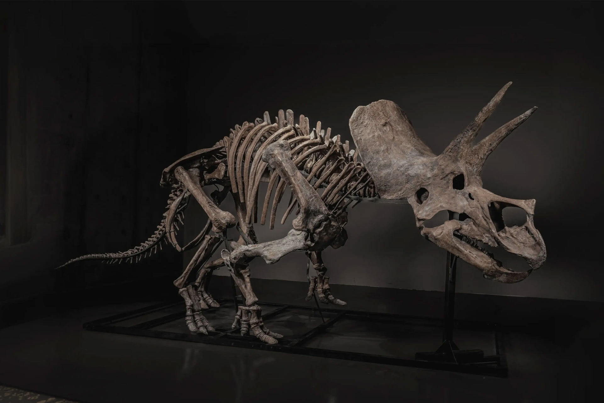For nearly thirty years, Trey stood at the heart of the Wyoming Dinosaur Center in Thermopolis, where more than one million visitors came face to face with the Triceratops. Now, for the first time, he's going up for sale through Pharrell Williams' auction platform. Excavated in 1993 from the Lance Formation near Lusk, Wyoming, Trey measures 17 feet, 4 inches long and stands over 7 feet tall at the horn. Preserved as a sub-adult, his bones have been colored by millions of years of mineral absorption. He is the only museum-exhibited Triceratops skeleton ever to come to auction.