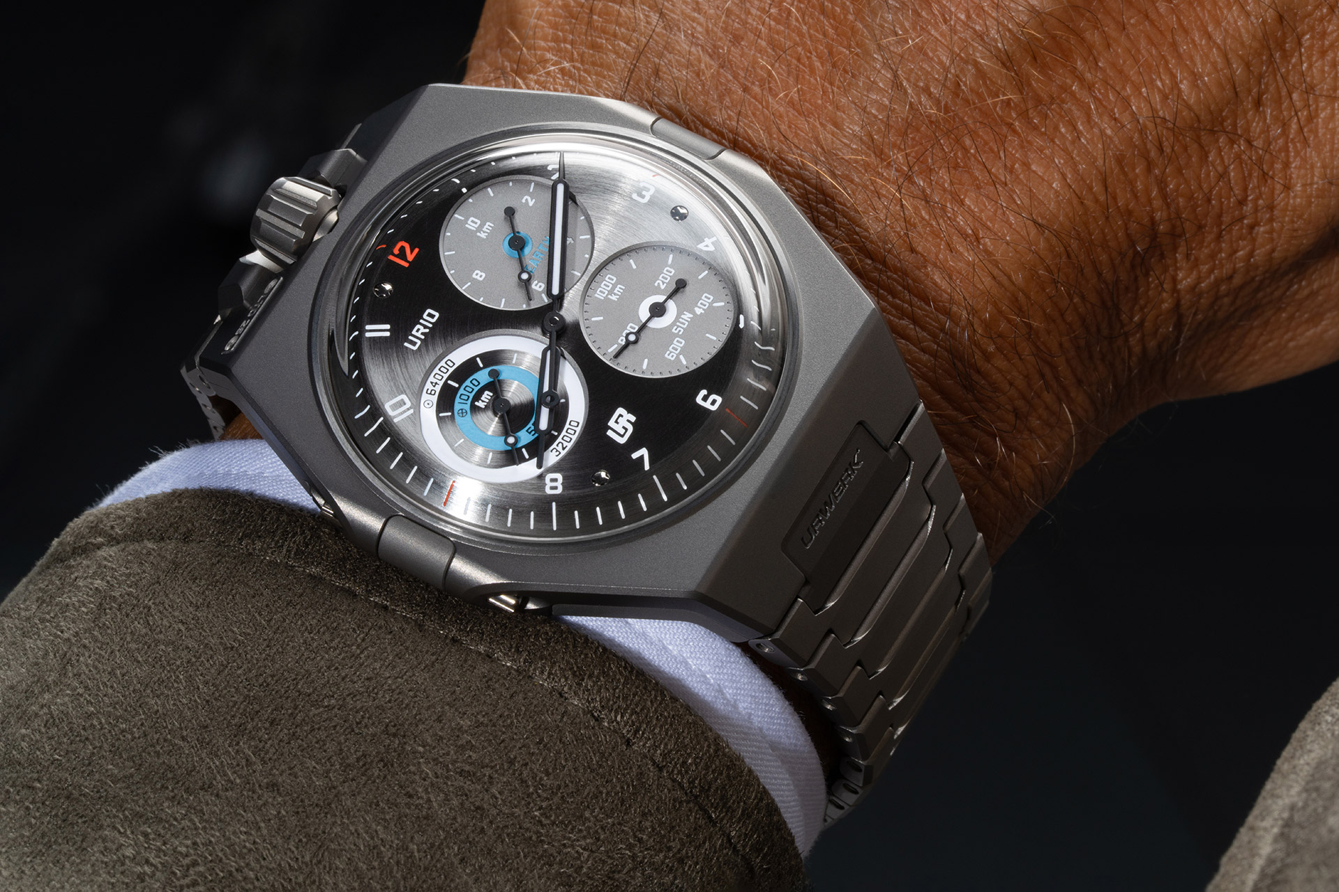 Urwerk is known for their innovative, visually striking wandering hours designs. Which makes the UR-10 Spacemeter a noticeable departure. At first glance, it looks like a normal chrono, with a round dial, hands in the center, and concentric counters. Look more closely, however, and it earns its "space" moniker with subdials that display the distance the Earth travels in its daily rotation, the distance it travels on its solar orbit, and one that combines both on two synchronized scales. It's powered by a self-winding UR-10.01 movement, which also uses a peripheral hand to track the hours on a 24-hour scale on the back of the 45.40 mm steel and titanium case. It's available with titanium and black dials, and limited to 25 examples each.