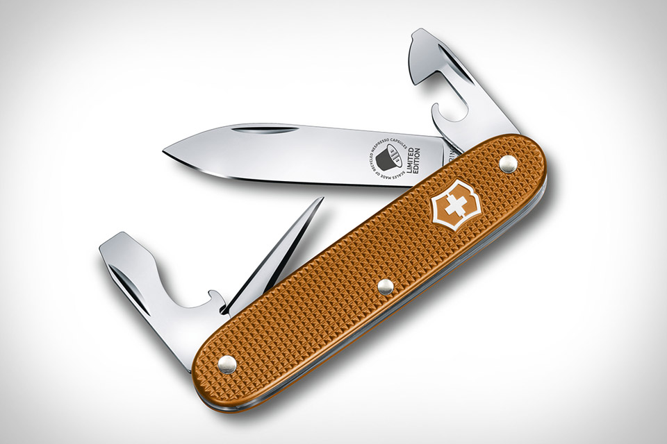 One of the biggest knocks on Nespresso is the waste created by the system's pods. The Victorinox Swiss Army Pioneer Nespresso Knife answers by using them in its construction. 24 recycled coffee capsules are used in the manufacturing of each knife's scales, enough to account for 18,000 pods over the limited run of 750 knives. Aside from the bronze-colored sides, it offers a blade, can opener, two screwdrivers, a bottle opener, a hole punch, and a wire stripper.