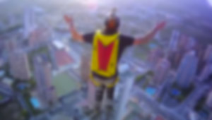 Three base jumping badasses leap from the elevator of the Bali Hotel in Spain.